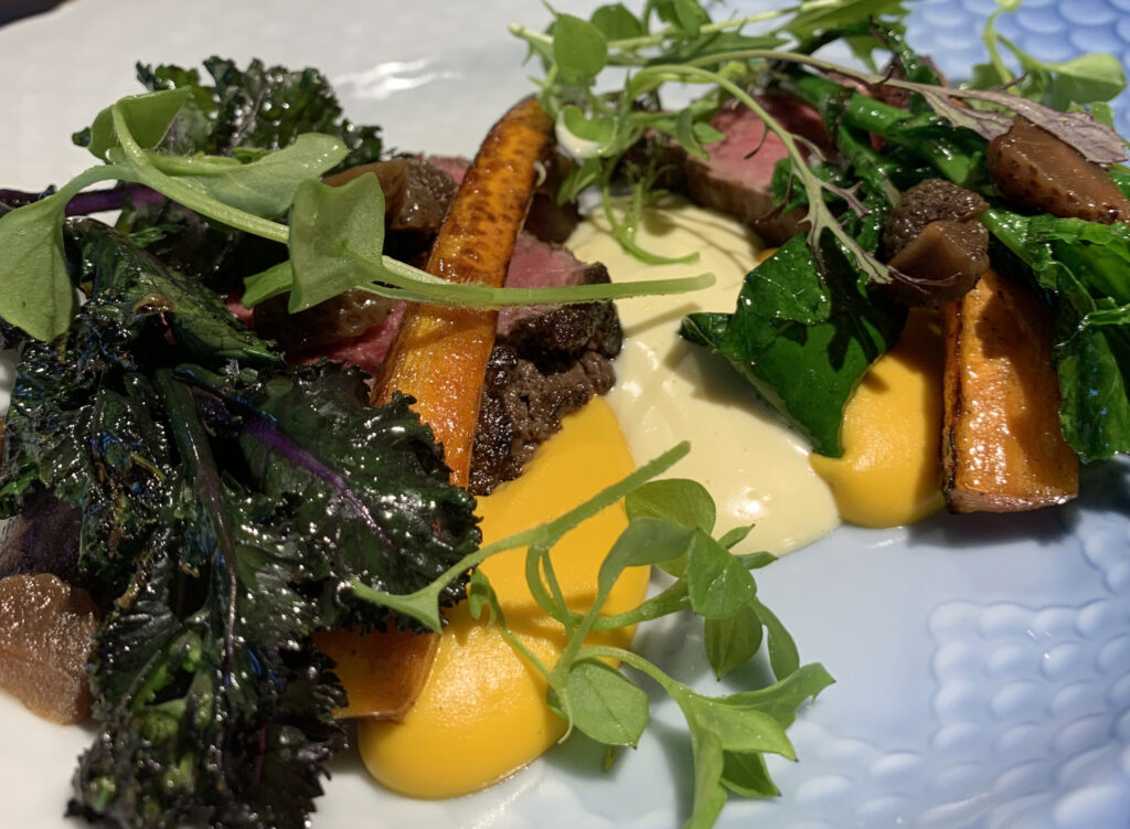 Langtidsstegt kalveculotte fra Himmerland, vendt i krydderurter, med ærtetimbale og tørsaltet bacon