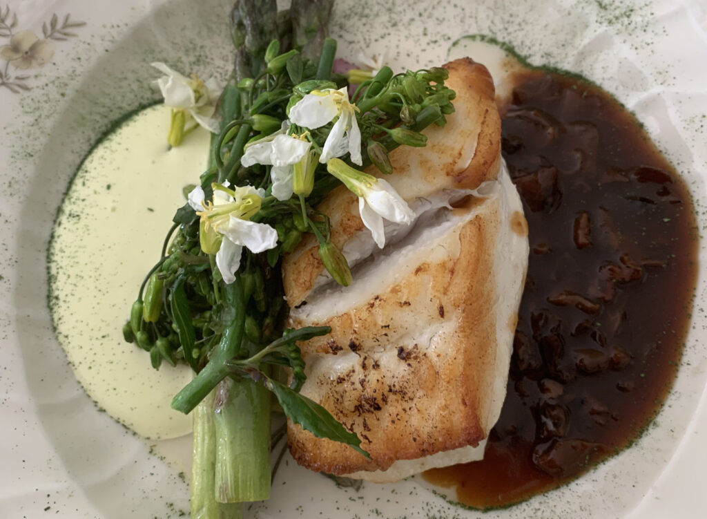 Kødet er fra Himmerland, fisken er frisk fanget fra Strandby, grøntsagerne er fra vores store køkkenhave og dressingen er lavet på økologisk creme fraiche 38%